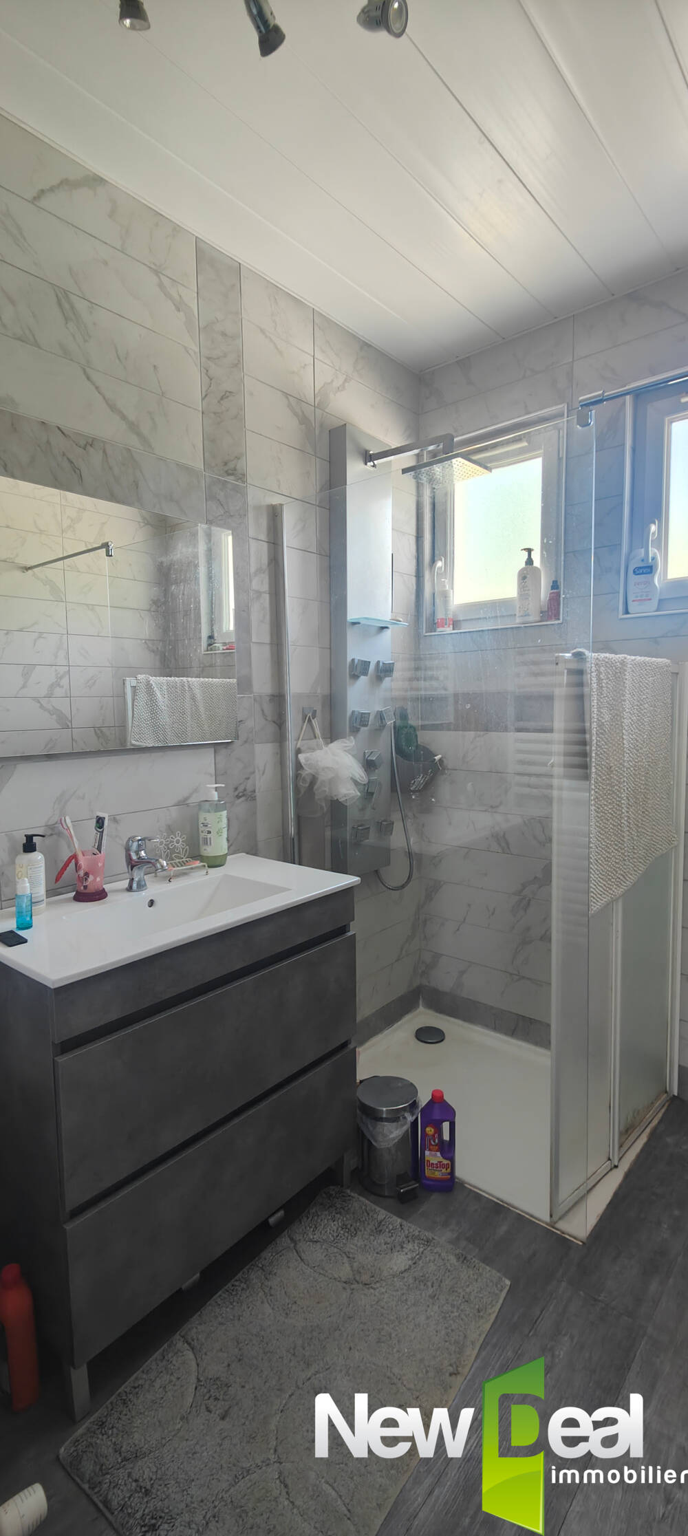 A l'étage, une cuisine ouverte avec accès direct sur la terrasse, un agréable salon / salle-à-manger ainsi qu'un dégagement menant à deux chambres de 13 et 14 m², des toilettes indépendantes et une salle-d'eau.