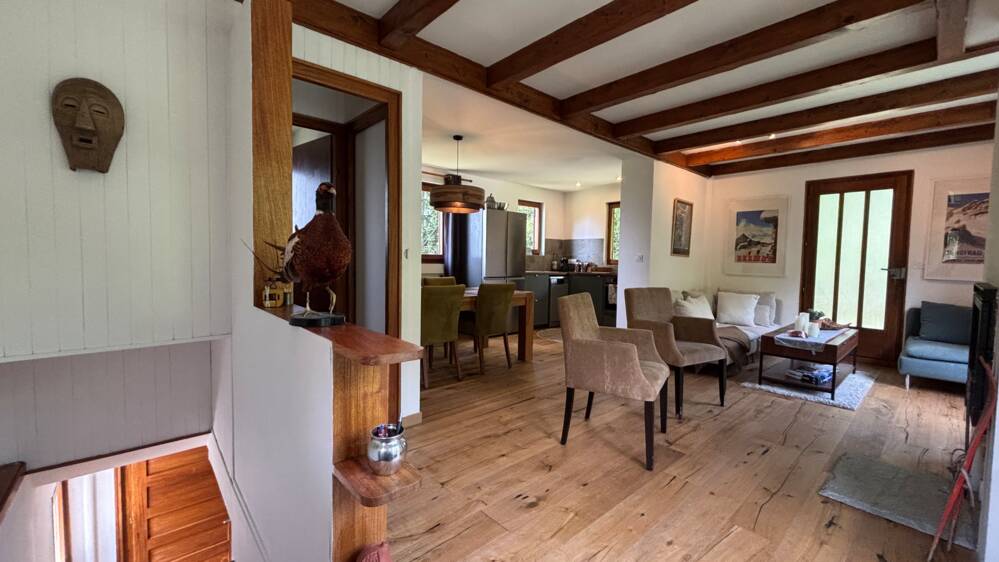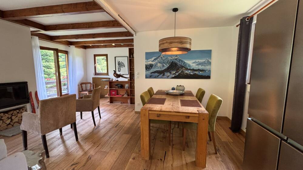 LC5077  Dans un environnement calme et verdoyant, découvrez ce chalet de charme d’environ 72 m² habitables (80 m² utiles), implanté sur un terrain d’environ 460 m² agrémenté d’un petit mazot typique. Édifié sur deux niveaux, il se compose comme suit : Rez-de-jardin : une entrée, deux chambres, une salle d’eau et la chaufferie. Étage principal : une belle pièce de vie avec cheminée, espace salle à manger, cuisine ouverte entièrement équipée, ainsi qu’une salle de douche avec WC. Depuis le séjour, vous profiterez d’un balcon-terrasse offrant une vue panoramique exceptionnelle sur le massif du Mont-Blanc. Ce bien séduira les amoureux de tranquillité et de nature, recherchant un cadre authentique et préservé à proximité du centre de Chamonix. Un véritable havre de paix au cœur de la vallée. Exclusivité à découvrir sans tarder.