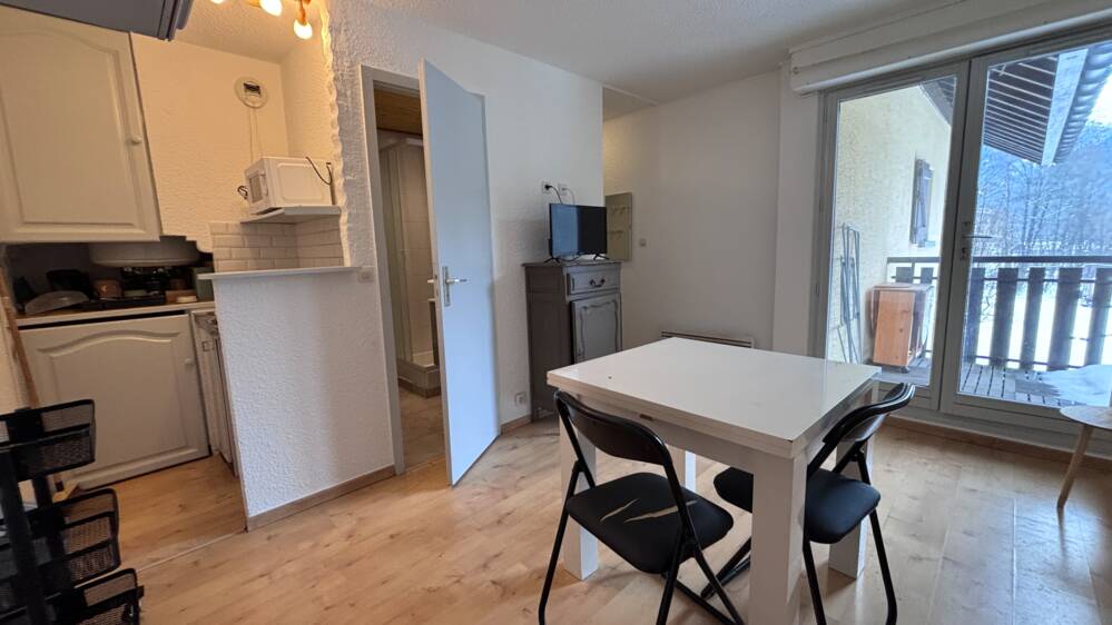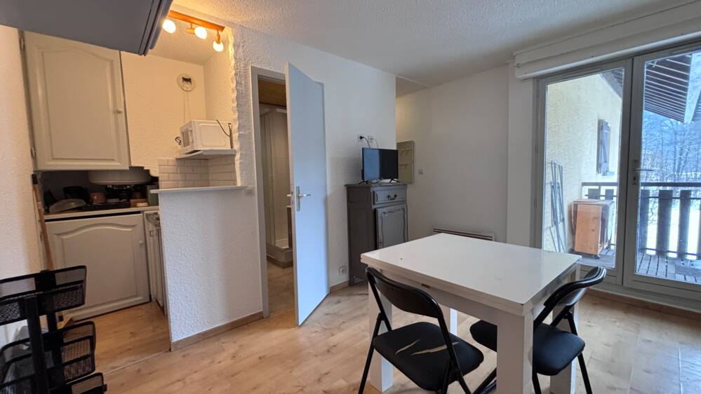 LC5301 VALLEE DE CHAMONIX Les Houches STUDIO de 17,45 m² avec balcon comprenant une entrée, un espace cuisine, une salle de douche et la pièce principale avec accès à un balcon. En deuxième étage ce studio Idéalement situé dans une copropriété avec piscine, un emplacement de parking privatif et un casier à skis. idéal investisseur ou primo accédant. A saisir