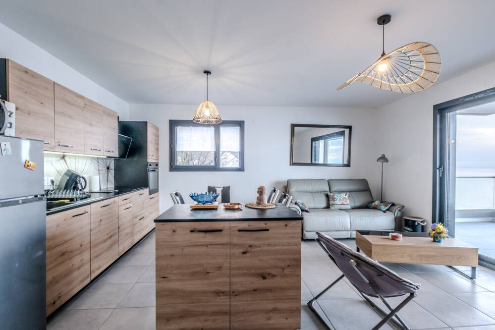 → Une belle pièce de vie baignée de lumière, avec un séjour ouvert sur une cuisine entièrement équipée.