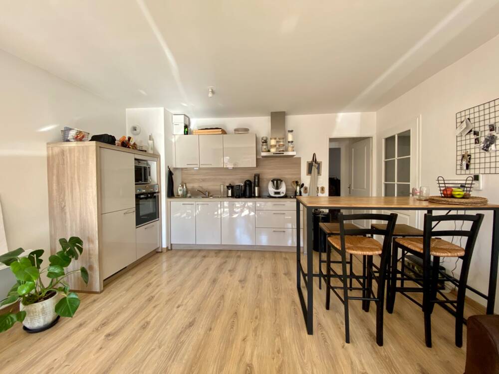 Une entrée distribue un cabinet de toilette, un cellier et une pièce de vie de 24m2 avec cuisine ouverte très bien équipée (réfrigérateur, plaque de cuisson, hotte et four).