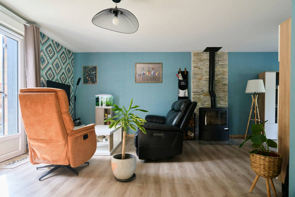 Commençons par la pièce de vie, baignée de lumière et d’une superficie de plus de 45 m², elle se compose de trois espaces ouverts : un salon chaleureux avec son beau poêle à bois , une salle à manger donnant sur la terrasse exposée plein Sud, ainsi qu’une cuisine entièrement équipée, ouverte sur la salle à manger.