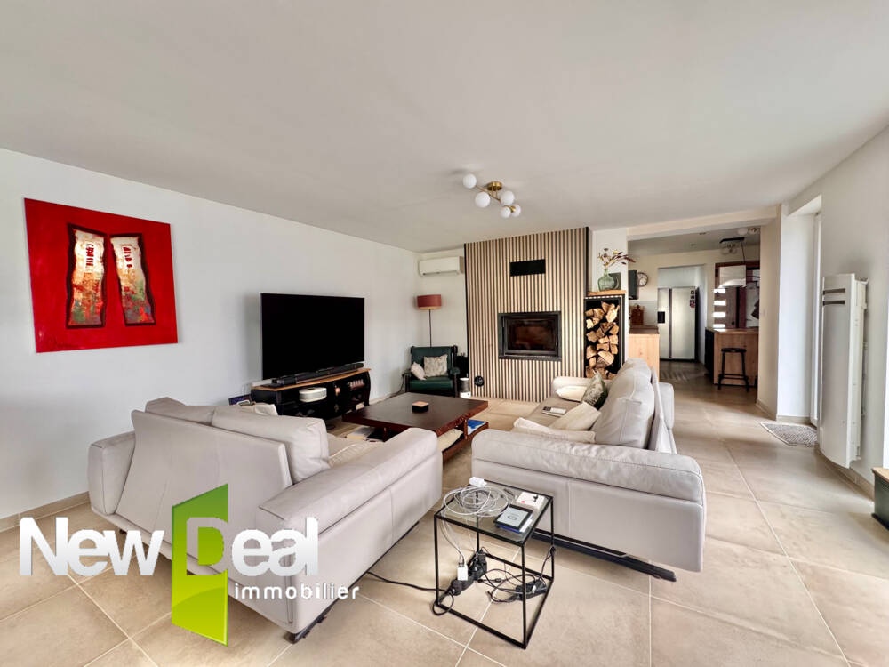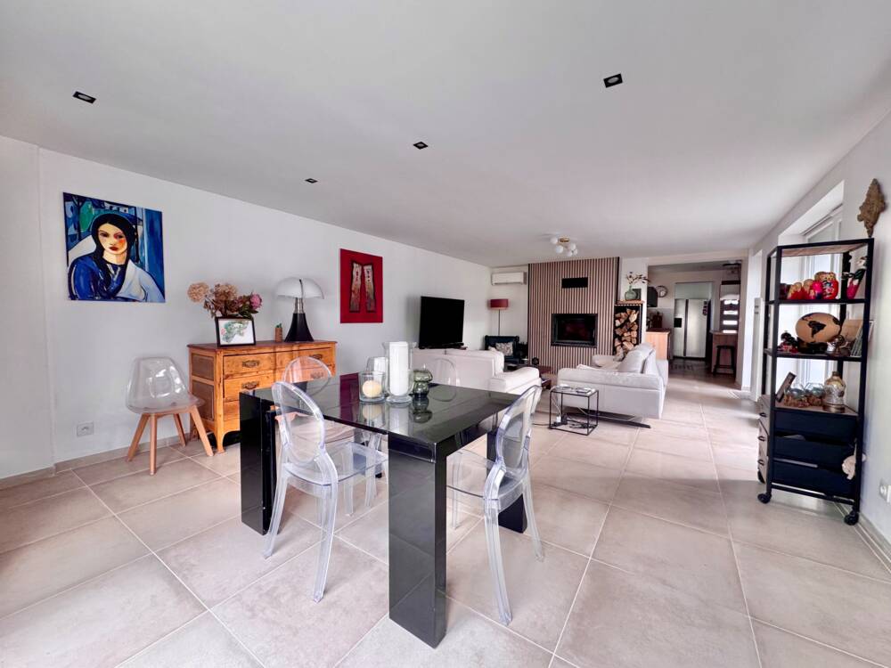 Une entrée séparée avec dressing vous amène à la cuisine équipée récente puis à la pièce de vie lumineuse de 40m2. Vous y profiterez de la chaleur agréable d'un insert bois, d'une vue agréable sur votre jardin et votre piscine et de l'accès à une terrasse en pierre bleue exposée Sud Ouest.