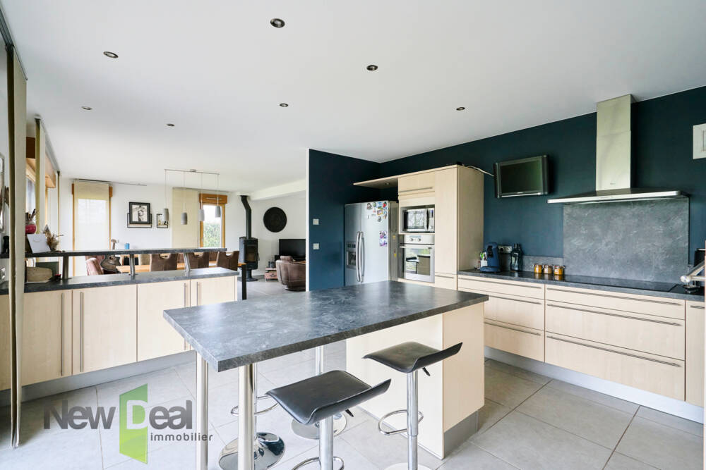 La pièce de vie, véritable cœur de la maison, développe plus de 65 m² baignés de lumière. Elle se compose d’un salon chaleureux avec poêle à bois, idéal pour vos soirées d’hiver, d’une salle à manger conviviale ouverte sur une terrasse exposée plein sud, et d’une cuisine entièrement équipée avec îlot central et espace snacking.