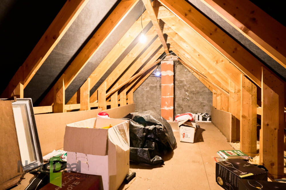 Un escalier escamotable donne accès à des combles isolés avec plancher et belle hauteur sous plafond, idéal pour le stockage.