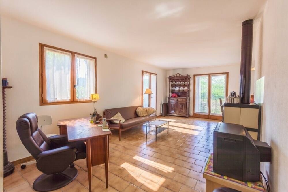 SOUS OFFRE D'ACHAT - CG5052_Montauroux, Venez découvrir cette propriété de plain-pied des années 80, édifiée en coteau, offrant une surface habitable d'environ 110 m² sur un terrain entièrement clôturé de 3 780 m². Cette maison comprend une entrée, un salon-séjour avec cheminée à foyer ouvert d'une surface d'environ 40 m², une cuisine spacieuse de 16 m² équipée d'un four à pain et à pizza, trois chambres d'environ 10 m² chacune, une spacieuse salle de bain et un WC séparé. En complément, une terrasse couverte type véranda attenante au salon-séjour, un garage faisant office d'atelier, ainsi qu'un autre garage en annexe incluant un espace de stockage complémentaire. Prix: 480.000€